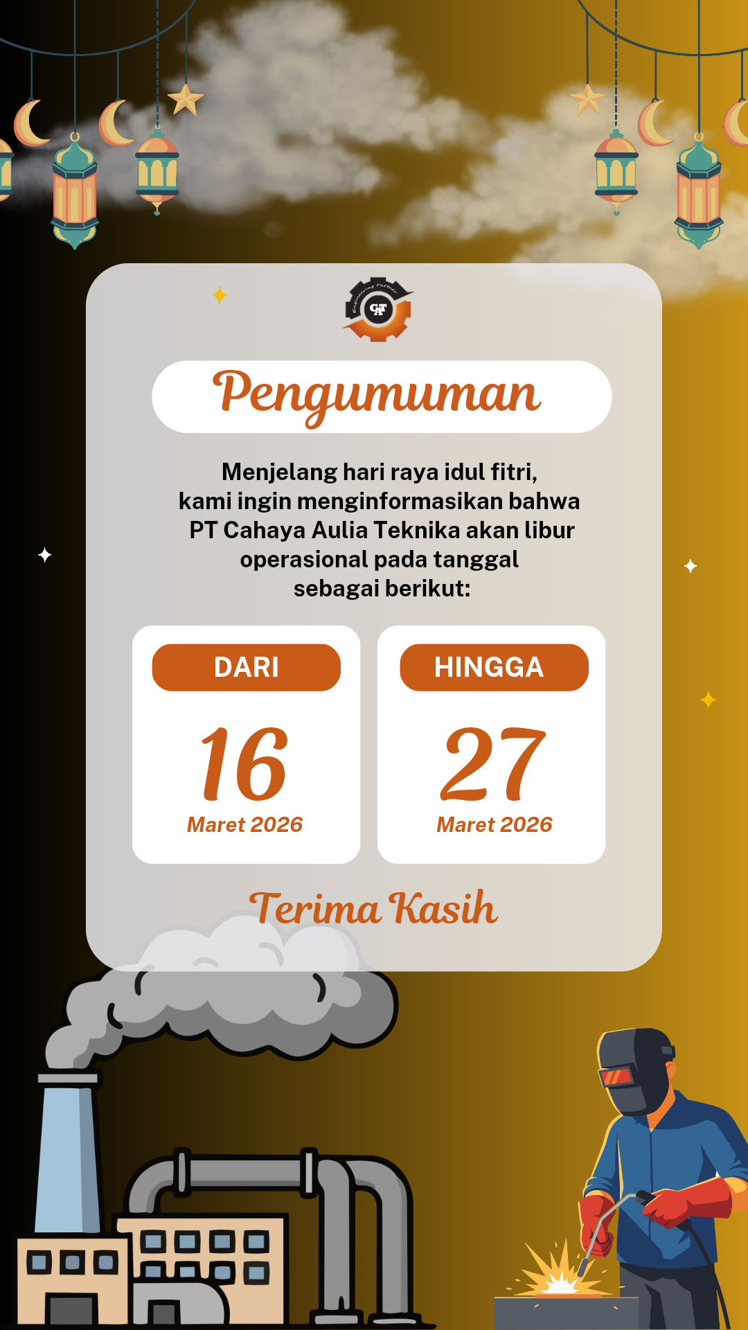 About Us Eid al-Adha Greetings PT Cahaya Aulia Teknika warmly wishes you and your loved ones a blessed and joyful Eid al-Adha 1446 H. May this sacred celebration bring peace, unity,... By: Pradnya Anya Jun 06, 2025 - 07:16
